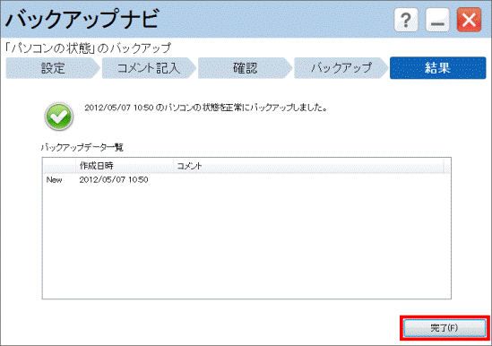 バックアップが正常に完了していることを確認し、「完了」ボタンをクリックします。