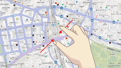 項目や画面を2本の指でタッチし、指を近づける動作です。スタート画面やアプリで表示を切り替えたり、Internet Explorerや地図で表示を縮小したりします。 - スワイプ