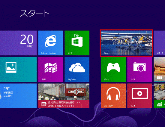 - スタート画面で「Bing」タイルをクリックまたはタップします。