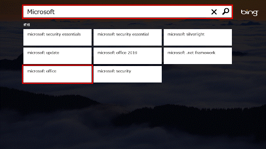 - Bingが起動します。キーワードを入力すると候補が表示されるので、目的のキーワードがある場合はクリックまたはタップします。ない場合はキーワードを最後まで入力し、キーボードの場合は【Enter】キーを押し、タッチキーボードの場合は「検索」をタップします。
