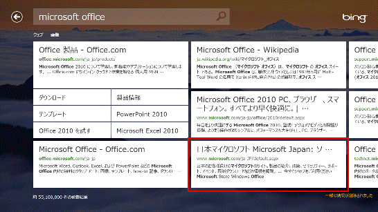 - 検索結果がスタート画面のタイルのように表示されます。検索結果をクリックまたはタップすると、Internet Explorerに切り替わります。