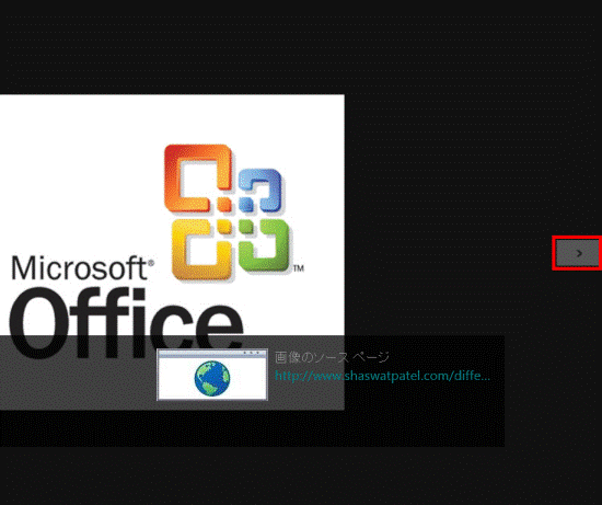 - 画像が1枚ずつ表示されるとともに、その画像が掲載されているホームページの情報が表示されます。マウス操作の場合は「<」、「>」をクリック、タッチ操作の場合は左右にスワイプすると、前後の検索結果の画像に移動できます。