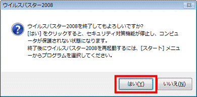 - 「ウイルスバスター2008を終了してもよろしいですか?」と表示されます。