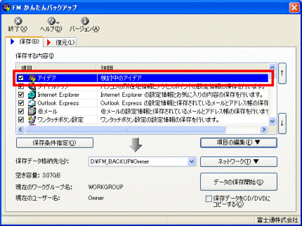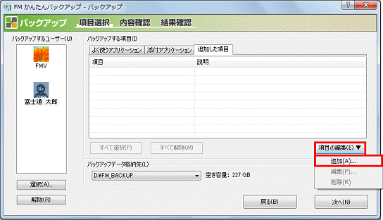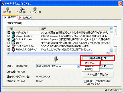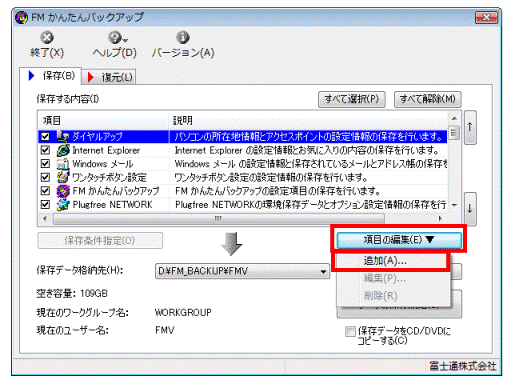 2002年冬モデル以前の機種にプレインストールされているFMかんたんバックアップでは、バックアップ項目の追加はできません。