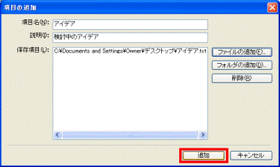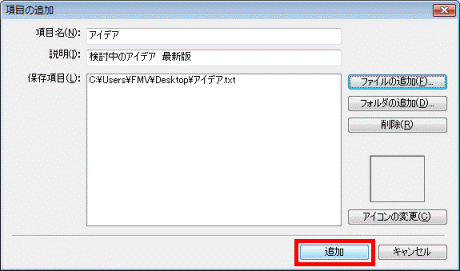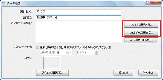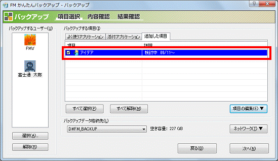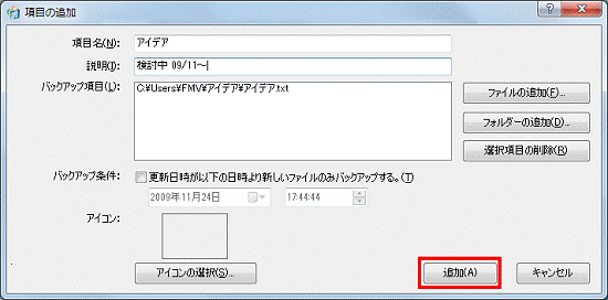 複数の項目を追加する場合は、手順5.〜手順11.を繰り返します。 - 「×」ボタンをクリックし、「FMかんたんバックアップ - バックアップ」を閉じます。