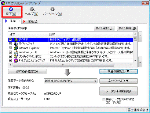 複数の項目を追加する場合は、手順8.〜手順13.を繰り返します。 - 「終了」ボタンをクリックし、FMかんたんバックアップを終了します。