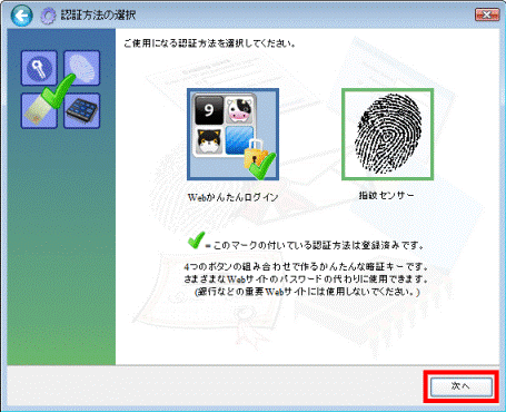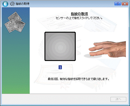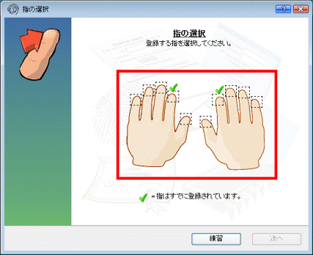チェックが付いていない指をクリックすると、指紋認証で使える指紋(指)を追加できます。 - 「次へ」ボタンをクリックします。