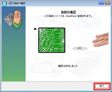 指紋を正しく読み取れなかった場合は、左上の「←」ボタンをクリックし、もう一度やり直してください。 - 「指紋の確認」が表示されます。