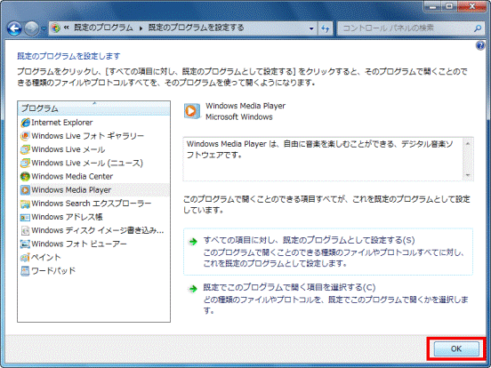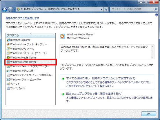 次の手順で起動するアプリケーションをWindows Media Playerに変更します。