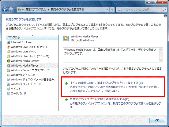 - 「すべての項目に対し、既定のプログラムとして設定する」をクリックします。