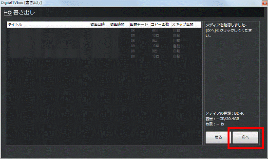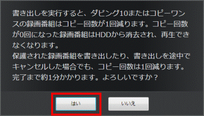 - 「書き出しを実行すると、タビング10またはコピーワンスの録画番組はコピー回数が1回減ります。」と表示されます。