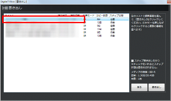 - 「左のリストで録画番組を選んで、[書き出し]をクリックしてください。」と表示されます。
