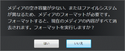 - 「メディアの空き容量が少ない、またはファイルシステムが異なるため、メディアのフォーマットが必要です。」