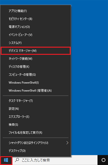作成中のファイルがある場合は、ファイルを保存します。 - 「スタート」ボタンを右クリックし、表示されるメニューから「デバイスマネージャー」をクリックします。