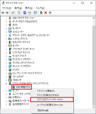 - 「HID 準拠マウス」を右クリックし、表示されるメニューから「デバイスのアンインストール」または「削除」をクリックします。