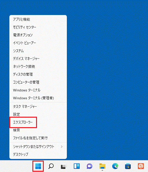 アドバイスタスクバーに「エクスプローラー」アイコンない場合は、「スタート」ボタンを右クリックし、表示されるメニューから「エクスプローラー」をクリックします。