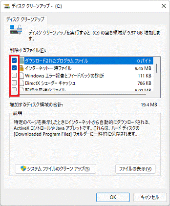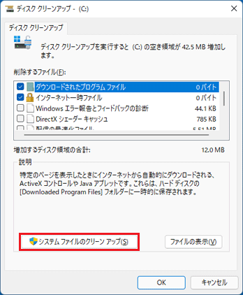 - ディスククリーンアップの画面で、「システムファイルのクリーンアップ」ボタンをクリックすると、削除するファイルの種類を増やすことができます。