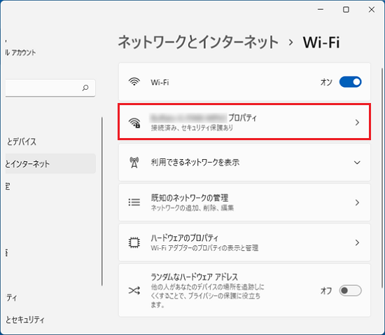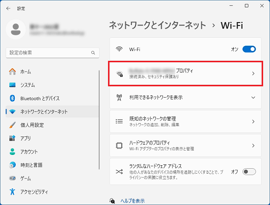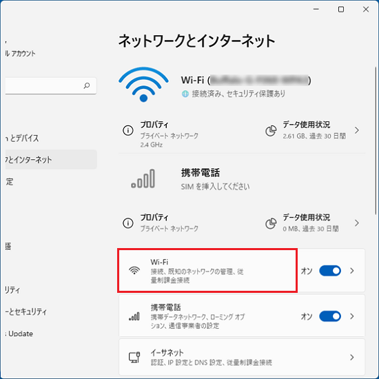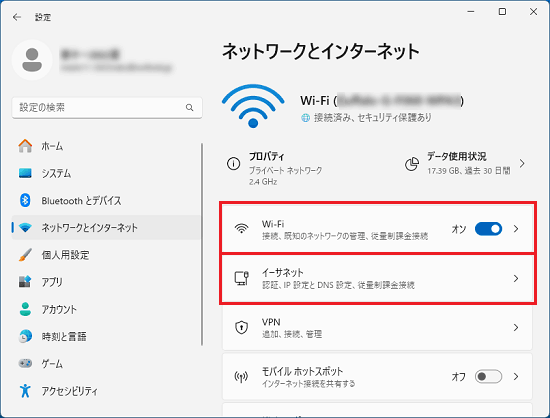 (「Wi-Fi」をクリックする場合の例) - 「Wi-Fi」または、「イーサーネット」と表示されます。
