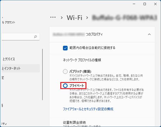 - 「ネットワークプロファイルの種類」の「プライベート」をクリックします。