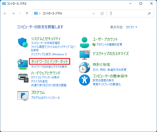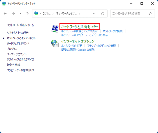 アドバイス「ネットワークとインターネット」が表示されない場合は、「ネットワークと共有センター」をクリックし、手順.11に進みます。