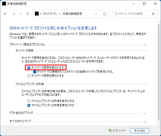 「ネットワーク探索」の「ネットワーク探索を有効にする」をクリックします。
