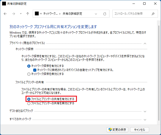 - 「ファイルとプリンターの共有」の「ファイルとプリンターの共有を有効にする」をクリックします。