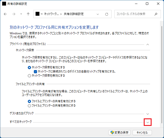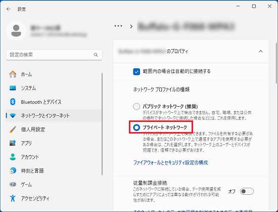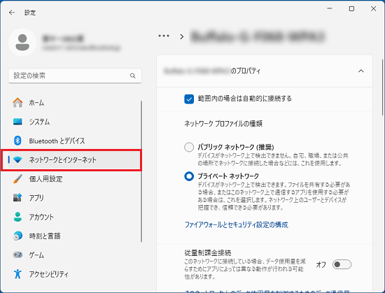 - 「ネットワーク プロファイルの種類」に表示されている、「プライベートネットワーク」をクリックします。