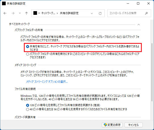 - 「パブリックフォルダーの共有」の「共有を有効にして、ネットワークアクセスがある場合は...」をクリックします。