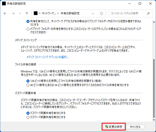 - 「パスワード保護共有」で、他のパソコンから、お使いのパソコンにアクセスしたときに、ユーザー名とパスワードの入力を求めるかどうかを、お好みで設定します。