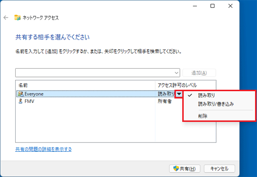 別のパソコンで設定した「アクセス許可のレベル」が正しいかどうかを確認します。 - 確認が終わったら、「×」ボタンをクリックし、クリックしたパソコンで共有されているフォルダーの画面を閉じます。