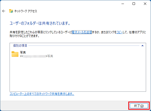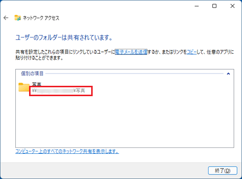 - 「ユーザーのフォルダーは共有されています。」と表示されます。