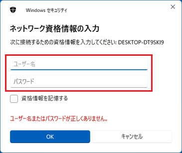 アドバイス「Windows セキュリティ ネットワーク資格情報の入力」と表示されたときは、選択したパソコンに設定されているユーザー名とパスワードを入力し、「OK」ボタンをクリックします。