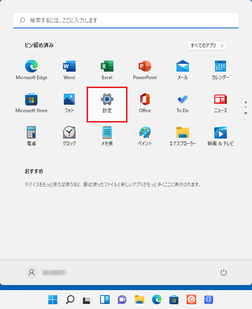 スタートメニューに「設定」がない場合は、「スタート」ボタン→右上の「すべてのアプリ」→「設定」の順にクリックします。