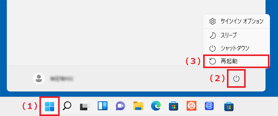 - 「スタート」ボタン→「電源」→「再起動」の順にクリックします。
