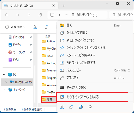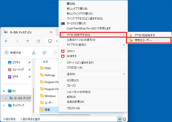 (ローカルディスク(C:)の「写真」フォルダーを共有する場合) - メニューの一覧が表示されます。