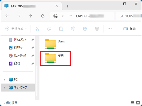 アドバイス上の画像は、Cドライブの直下に「写真」フォルダーを作成し、共有している場合の例です。