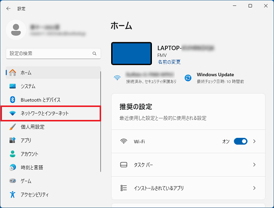 アドバイス「ネットワークとインターネット」が表示されていない場合は、「設定」の左にある「
