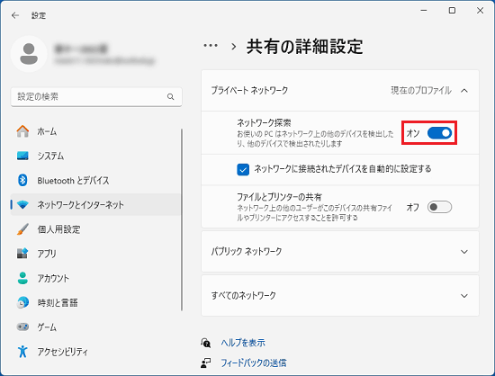 「プライベートネットワーク」に表示されている「ネットワーク探索」のスイッチをクリックし、「オン」(青色)にします。