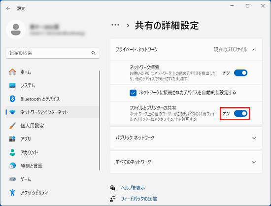 - 「プライベートネットワーク」に表示されている「ファイルとプリンターの共有」のスイッチをクリックし、「オン」(青色)にします。