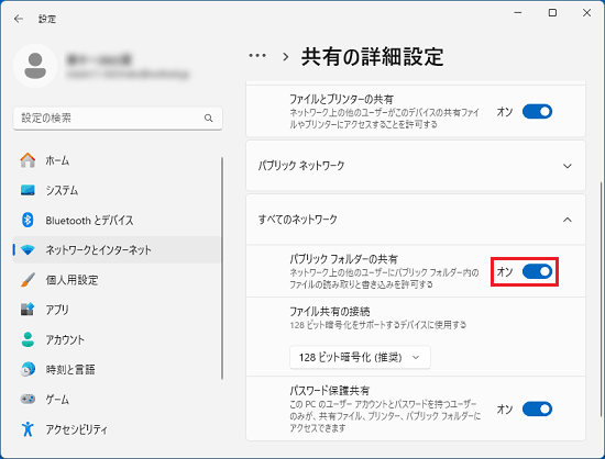 - 「パブリック フォルダ−の共有」スイッチをクリックし、「オン」(青色)にします。