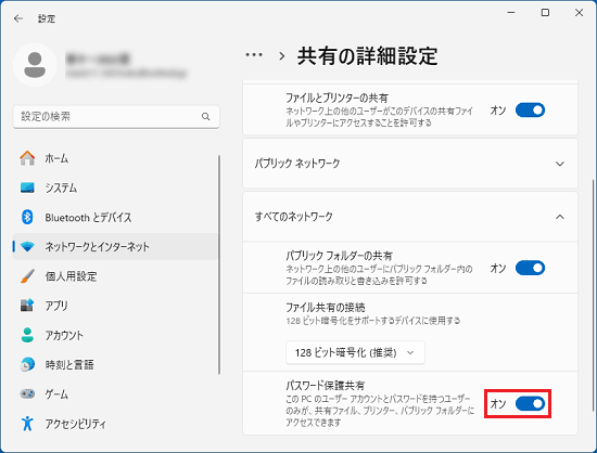 (「オン」(青色)の状態になっている場合の例)重要「パスワード保護共有」を有効にした場合は、アクセスされる側のパソコンのユーザーアカウントにパスワードが必要です。