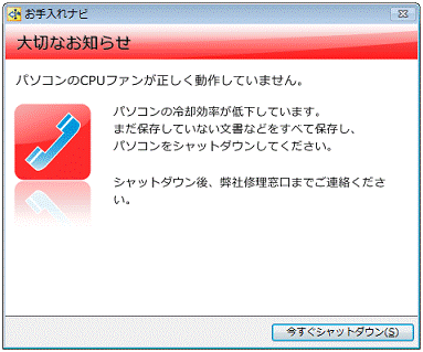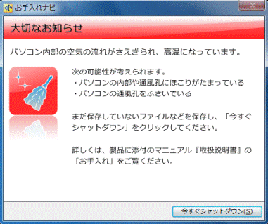 アドバイス「今すぐ清掃する」ボタンをクリックすると、「空冷用通風路(または、パソコンの内部や通風孔)のお手入れをするにはパソコンをシャットダウンする必要があります。今すぐシャットダウンしますか?」と表示されます。