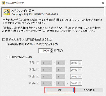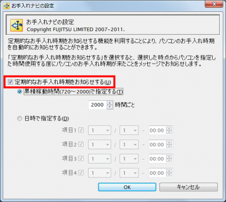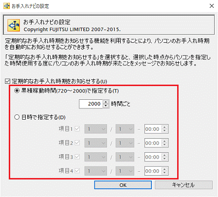- お好みで、「累積稼働時間(720〜2000)で指定する」または「日時で指定する」のいずれかの項目をクリックします。