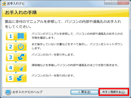 画面の指示にそって、準備をし、電源を切る準備ができたら、「今すぐ清掃する」ボタンをクリックします。