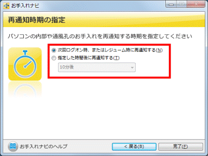 お好みで、「次回ログオン時(サインイン時)、またはレジューム時に再通知する」、または「指定した時間後に再通知する」をクリックし、「完了」ボタンをクリックします。