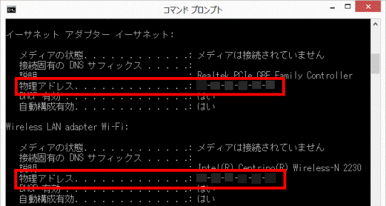 - 「物理アドレス」の右に表示されるMACアドレスを確認します。