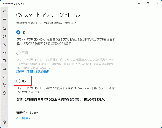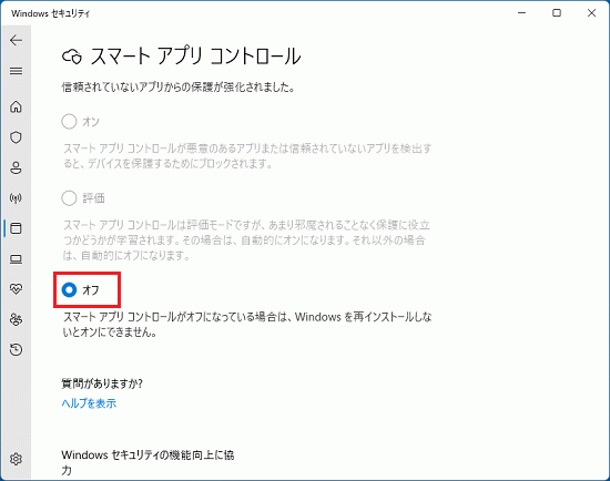 スマートアプリコントロールは、Windows セキュリティからオフにできます。