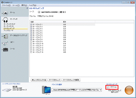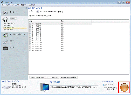 Roxio Creator LJで、音楽CDからパソコンに音楽を取り込む方法は、次のとおりです。