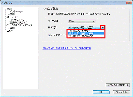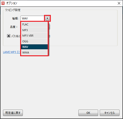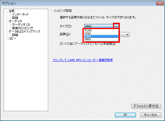 アドバイス「タイプ」(ファイル形式)は、「WAV」、「WMA」、「OGG」、「FLAC」から選択できます。