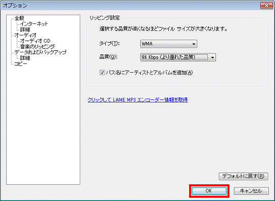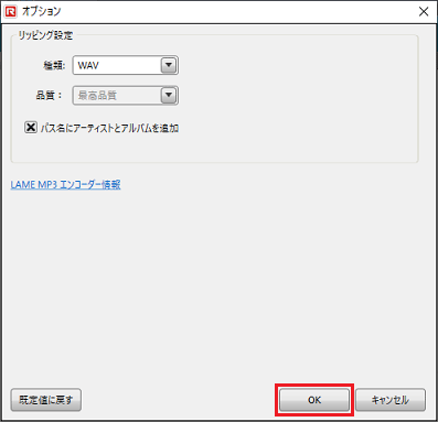 アドバイス- 標準では、「C:¥Users¥(ユーザー名)¥Music」 (「ミュージック」フォルダー)に「不明なアルバム」フォルダーが作成され、その中に保存されます。